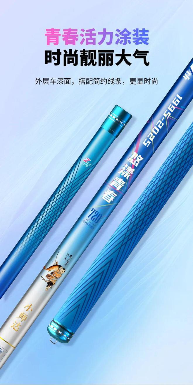 从国潮水墨范到青春活力派,小师达悠漾青春全能综合竿,整支钓竿图案以电光蓝,蓝色为主,白色点缀,蓝色也是代表青春活力,涂装时尚绚丽,非常符合年轻人审美